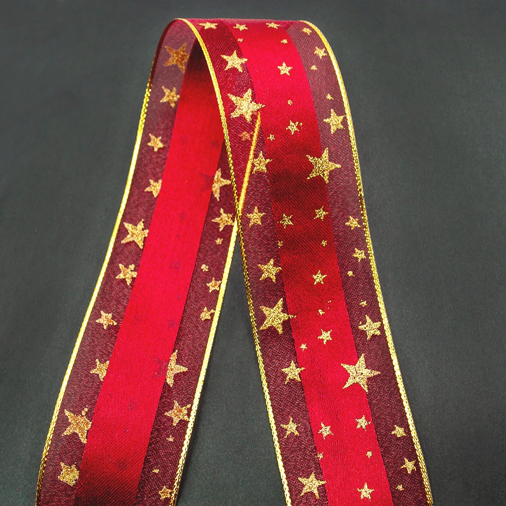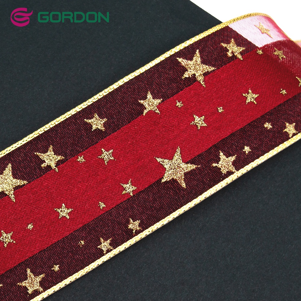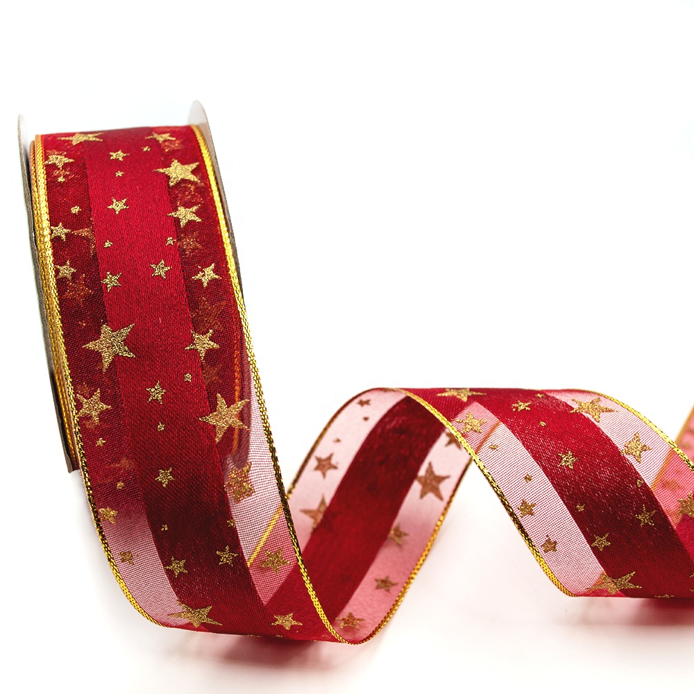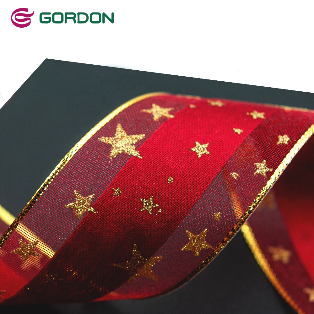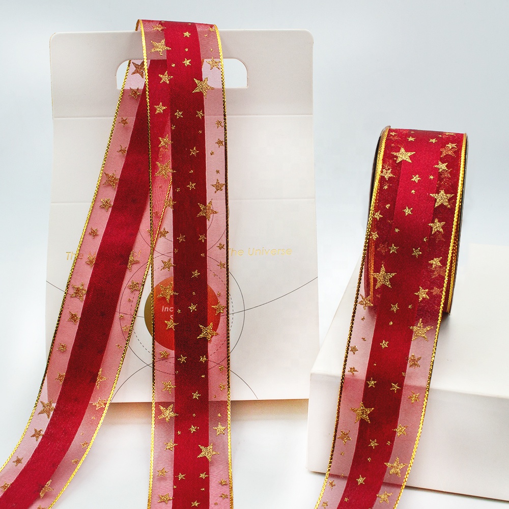 - Gordon Ribbons printed organza custom 3D gold foil star printed ribbon red sheer organza ribbon for gift package decorative